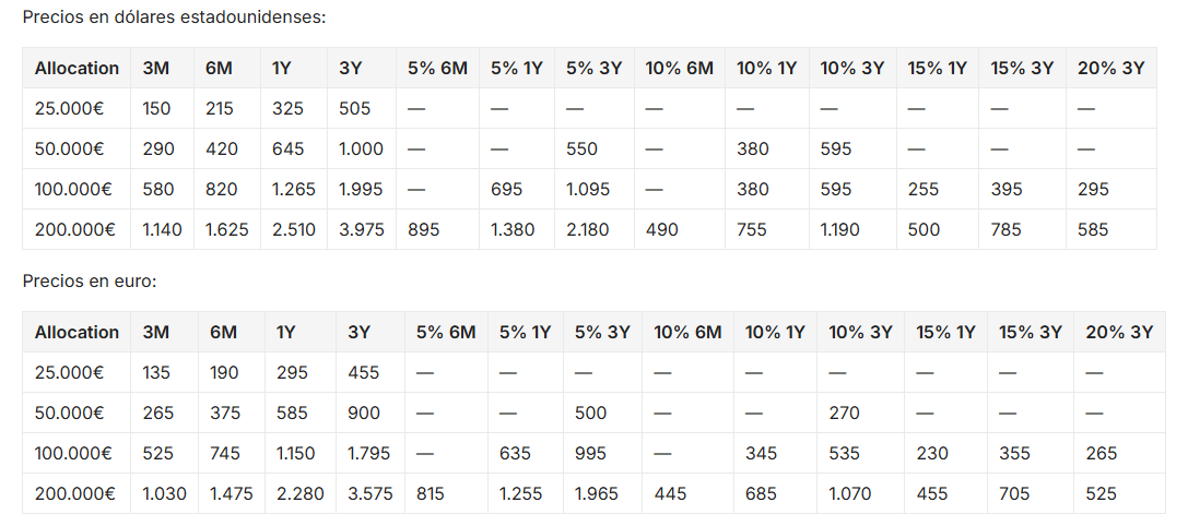 Se ofrecen cuatro objetivos de rentabilidad: 5 %, 10 %, 15 % o 20 %, además de una opción para adquirir un booster inmediato sin objetivo de rentabilidad. Cuanto mayor es el objetivo de rentabilidad, menor es el precio.