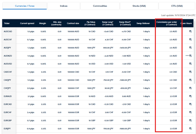 In the case of both Forex and commodities, the gross commission would be around 0.005% of the trade's nominal value in the base currency.