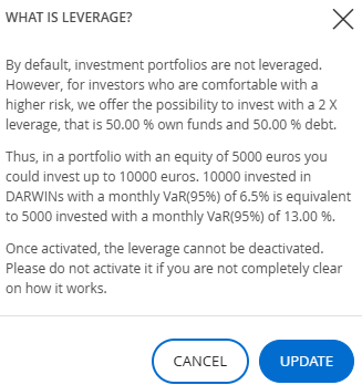 For investors who are comfortable with higher risk levels than DARWINs' default 6.5% monthly target VaR(95%), we offer the possibility to increase your portfolio leverage up to 3:1.